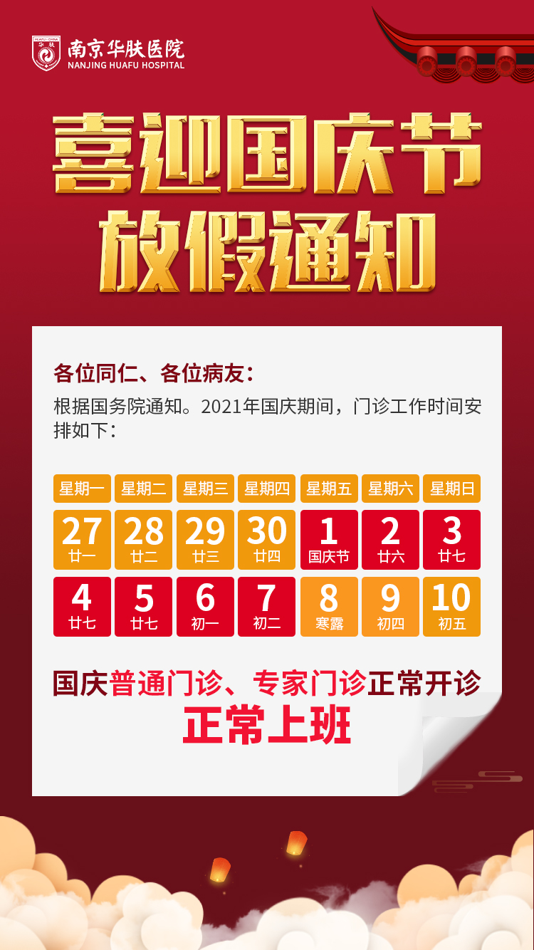 为方便市民在国庆中秋放假期间能够正常就医,南京华肤医院坚持“服务无假日”原则,相继开展了无假日医院、假日专家门诊等便利市民就医的举措